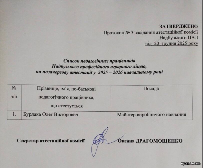 Протоколи засідання атестаційної комісії Надбузького професійного аграрного ліцею