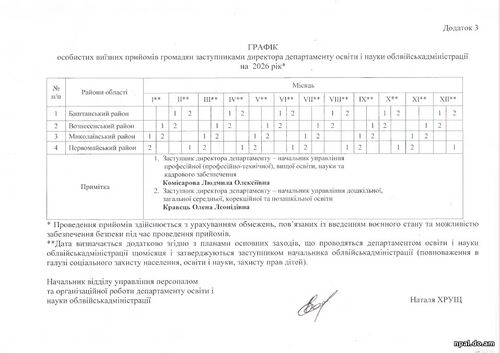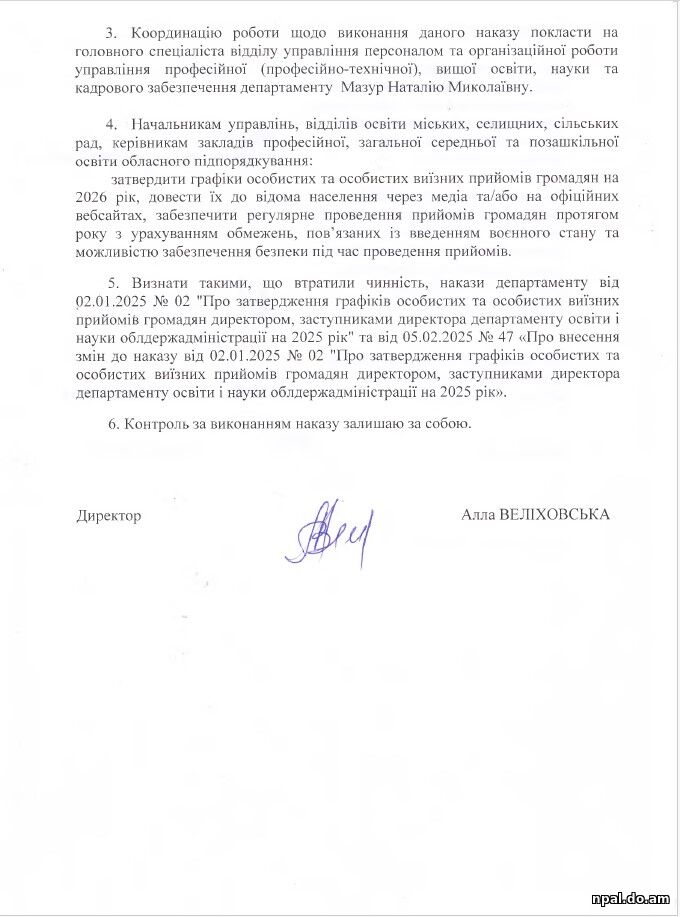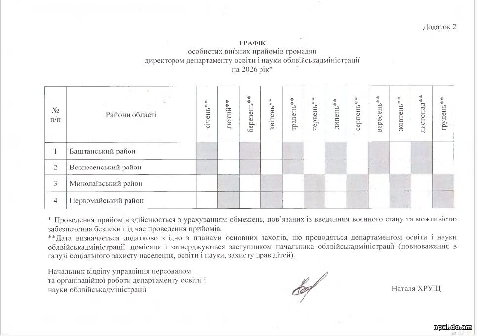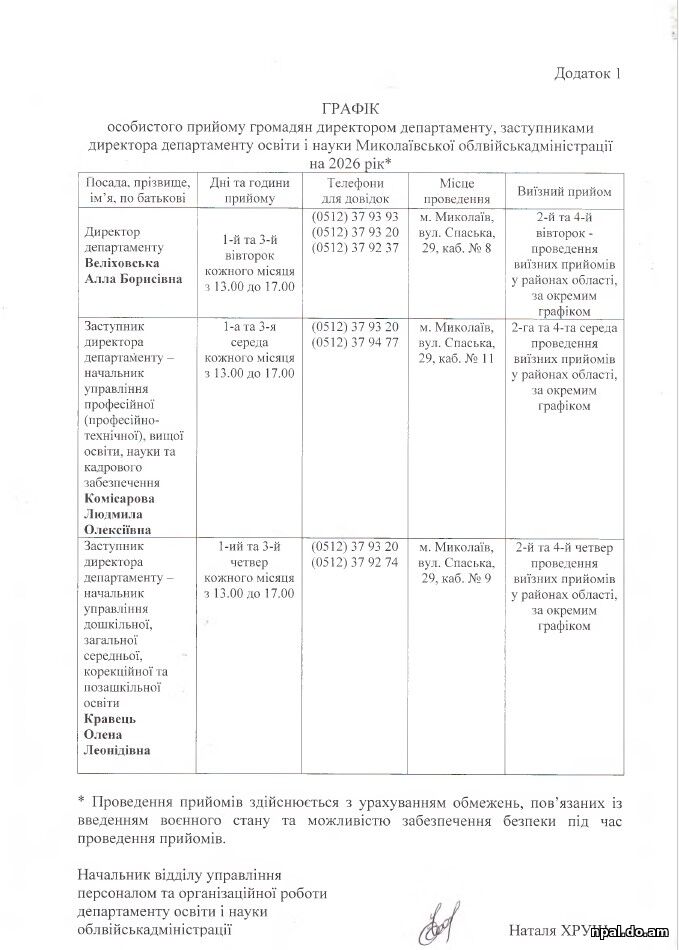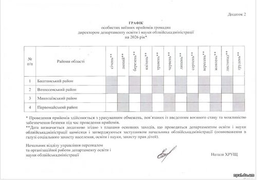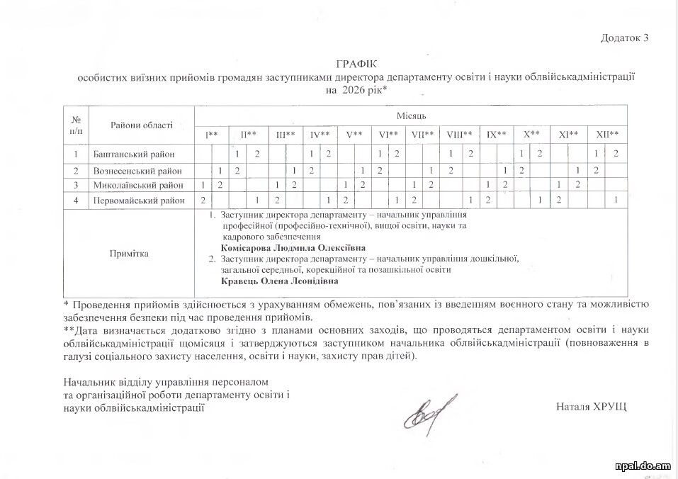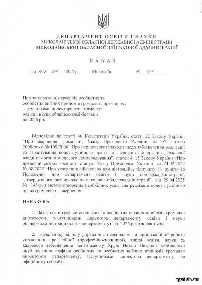 Про затвердження графіків особистих та особистих виїзних прийомів громадян директором, заступниками директора департаменту освіти і науки облвійськадміністрації на 2026 рік