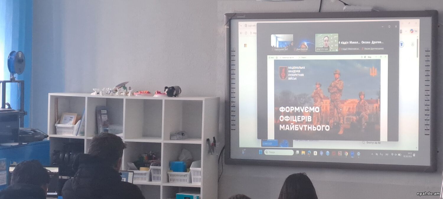 Проведено онлайн зустріч з представниками Національної академії сухопутних військ ім. Гетьмана Петра Сагайдачного. Студенти ознайомилися з напрямками підготовки: піхота, реактивні війська і артилерія, інженерне забезпечення, психологічна підтримка персоналу. Донесено інформацію щодо особливостей навчання в академії: умови для особистісного зростання, посилене вивчення англійської мови, сучасна навчально-матеріальна база та викладачі з актуальним бойовим досвідом, найбільший навчальний полігон у Європі та розташування в історичній частині Львова, причетність до спільноти випускників Національної академії СВ та багато іншого.