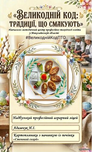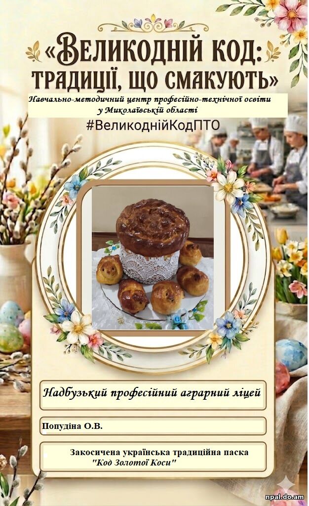 Надбузький професійний аграрний ліцей під керівництвом старших майстрів Середенка В.М. та Гончарика С.І. взяв участь у проведенні гастрономічної виставки у форматі онлайн-челенджу «Великодній код: традиції, що смакують», ініційованої Навчально-методичним центром професійно-технічної освіти у Миколаївській області.